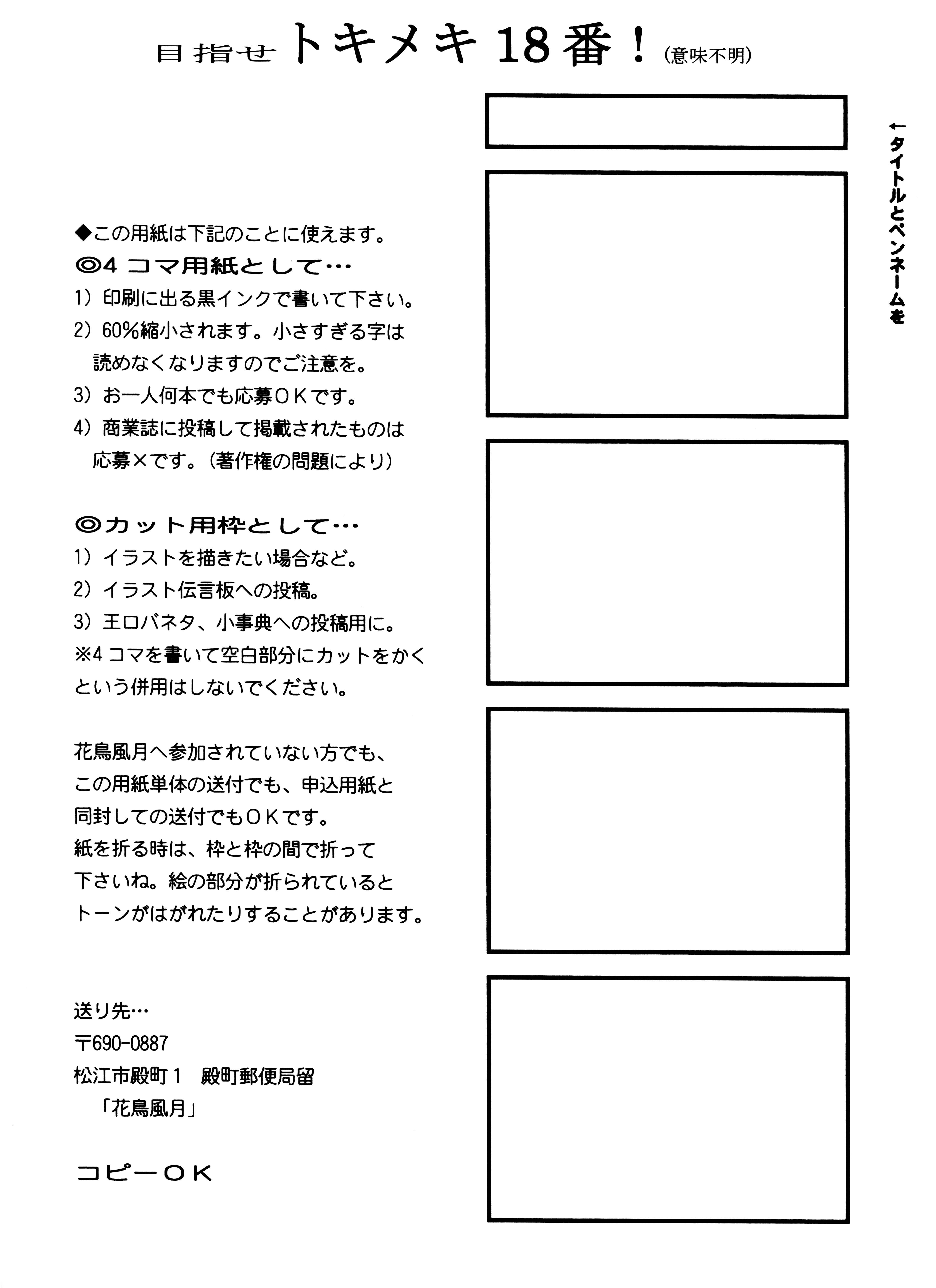 こちらまで、110円切手を貼った返信用封筒を同封し、「アンケート用紙希望」と書いたメモを入れてご請求下さい。(4コマ用紙も同封されます)